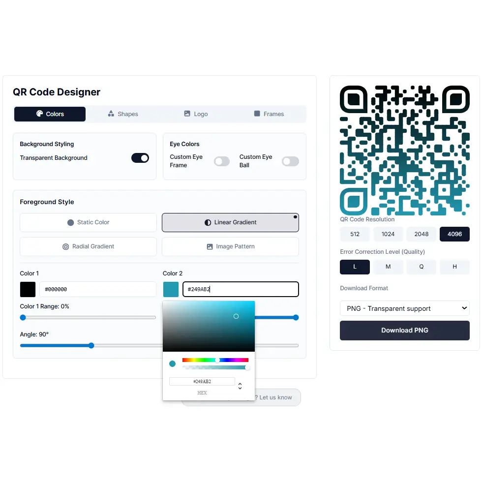 The designer generates ready-made colour combinations automatically. Click one to apply it instantly, then fine-tune further if you want โ or build your own colours from scratch using the colour picker. Prefer a plain default? The black-and-white QR code is always one click away.