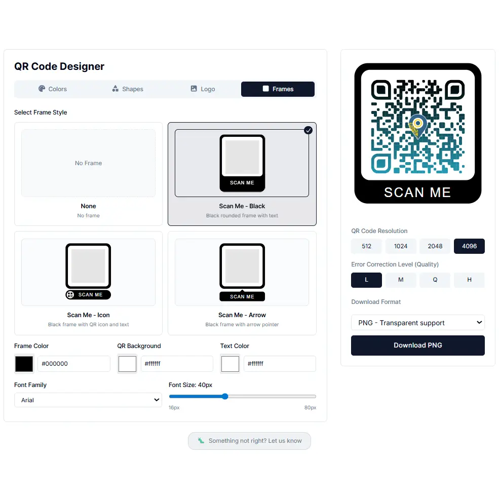 A frame goes around the outside of the QR code and can include a short label โ "Scan me", "Visit our site", or your own text. Optional, but on printed materials a clear call-to-action noticeably increases scan rates.